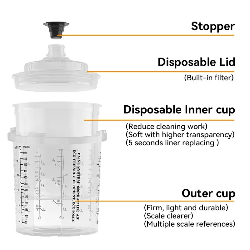 650 мл наявна чашка для розпилювального пістолета-це одноразова система розпилювальної чашки, розроблена для 3-панельного ремонту, вона підходить для ділянок, що потребують 22 фль у Оз (650 мл) або менше матеріалу. На основі серії 2.0 він має оновлену конструкцію зовнішньої чашки. Зовнішня чашка використовує вбудований замок для блокування кришки чашки, усунення компонента коміра, що полегшує заміну внутрішньої чашки. Наша фабрика має одноразові чашки фарби на складі, які можуть задовольнити потреби швидкої доставки оптових торговців. Час доставки зберігання 1-2 дні. В той же час ми також надаємо послуги OEM \ ODM для задоволення потреб у налаштуванні брендів із середнім часом доставки 15-20 днів.