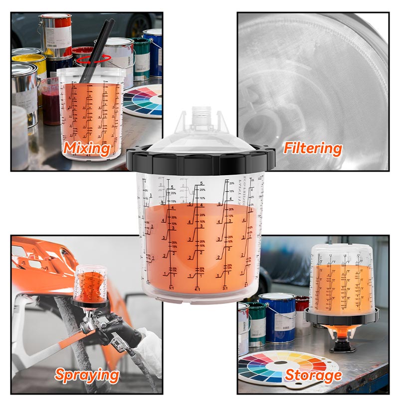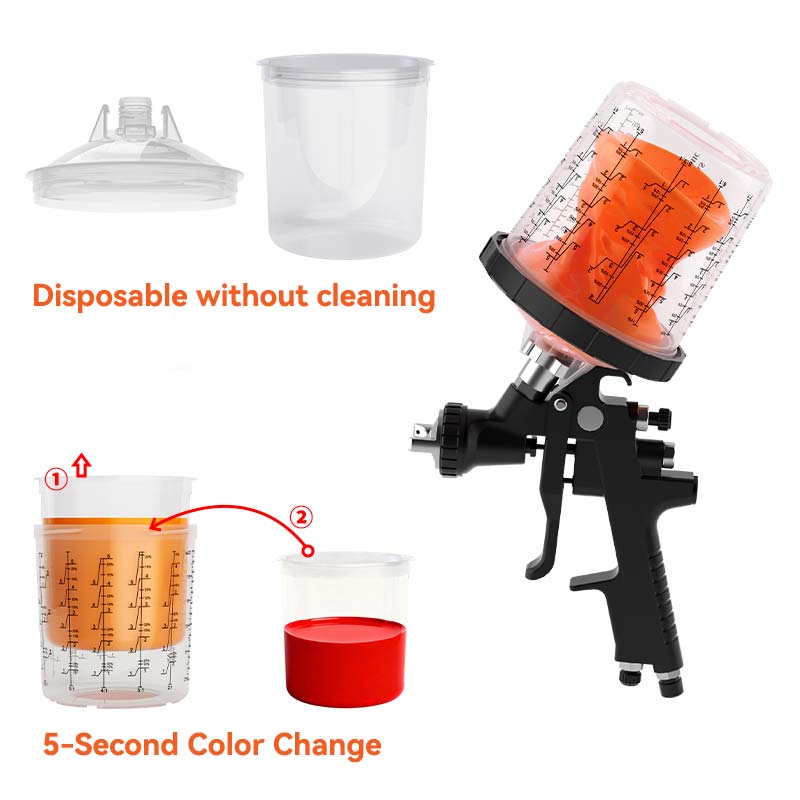 Theодноразовий стакан для фарбопульта не вимагає очищення після використання; просто викиньте внутрішню чашку, щоб швидко змінити колір, зменшивши інтервал зміни кольору з 20 хвилин до 5 секунд, фактично подвоюючи щоденне виробництво. Кришка має вбудований фільтр тонкого очищення для ефективного фільтрування домішок, забезпечуючи рівномірне та гладке розпилення, що забезпечує високу якість обробки.