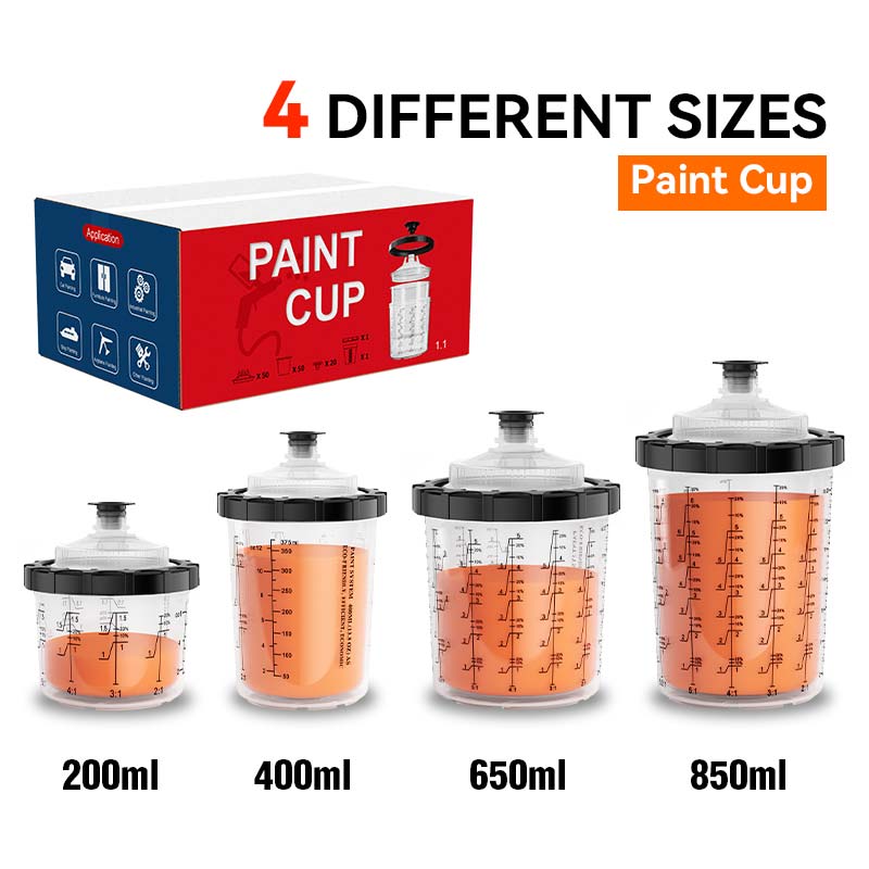 На основі ринкових досліджень, Кубок фарб доступний у чотирьох специфікаціях потужностей: 200 мл, 400 мл, 650 мл та 850 мл, що обслуговує різні сценарії використання, будь то для розпилення великої області чи детальних сенсорних засобів. Крім того, конструкція внутрішньої чашки була оптимізована для забезпечення гладкого потоку фарби, зменшення засмічення та відходів.